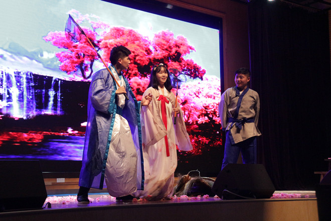 朦胧的路灯,清凉的傍晚,时代的洪流,深情的等候……话剧一开始,全场观众就被云之凡和江滨柳所吸引。全剧共6幕,整场演出用时约1个半小时,剧组演职人员一共30人,为近600位师生和家长带来一场精彩纷呈的演出。——《暗恋》和《桃花源》,两个不相干的剧组,都与剧场签定了当晚彩排的合约。双方争执不下,谁也不肯相让。演出在即,他们不得不同时在剧场中彩排,遂成就了一出古今相对、悲喜交错的舞台奇观。《暗恋》的“悲”和《桃花源》的“喜”互为表里,相辅相成。