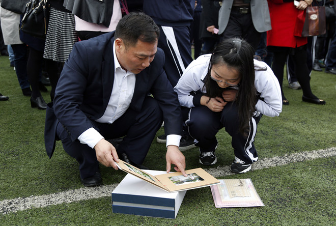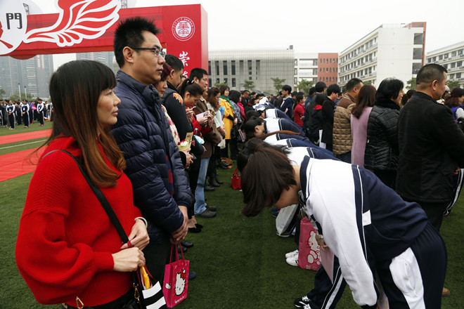 3月16日下午16时,华中师大龙岗附中在足球场为2016届的634名学子举办了隆重的成人礼暨高考冲刺誓师大会。634名学子的父母悉数到场,和学校全体行政及高三年级全体教师一起出席了这一庄严的仪式。“半个月前收到学校成人礼邀请函的时候,我非常激动,我和孩子的爸爸精心准备了一本《成长相册》作为礼物,来庆贺孩子‘成年’这个特殊的日子。”陈楷同学的妈妈手捧精致的相册说道。现场几乎所有的家长都为孩子准备了成年礼物,有鲜花、幸运符、亲手织的围巾、信件等,都希望能给即将成年的孩子们最好的祝福。