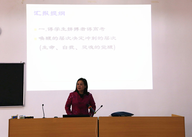 首先,冷老师向全场教师说明了学生“唤醒的层次决定冲刺的层次”,身为教师,我们应当引导学生,产生生命、自我和灵魂的觉醒。她指出,这种觉醒会直接影响到学生学习的主动性,在高三备考阶段,学生对学习的态度会直接影响他们的复习效果。在阐述的过程中,冷老师运用了大量的教学案例,生动形象地展示了她在教学过程中是如何引导学生正确认识考试,认识学习,以及如何端正学生学习态度,提高学习积极性。