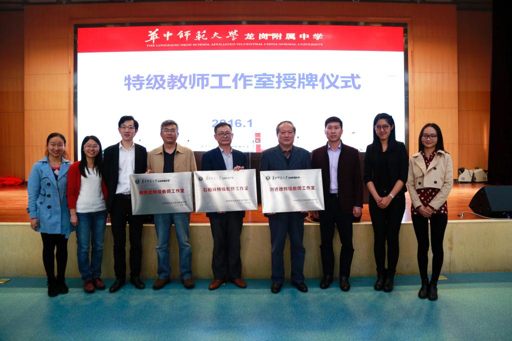 授牌仪式上,华中师范大学教学处张劼主任宣布了华中师大龙岗附中成立特级教师工作室的决定及首批特级教师工作室主持人和工作室学员名单。张丽清副校长和李宏副校长代表学校向刘道德、师修武、石柏兴三位特级教师授牌。