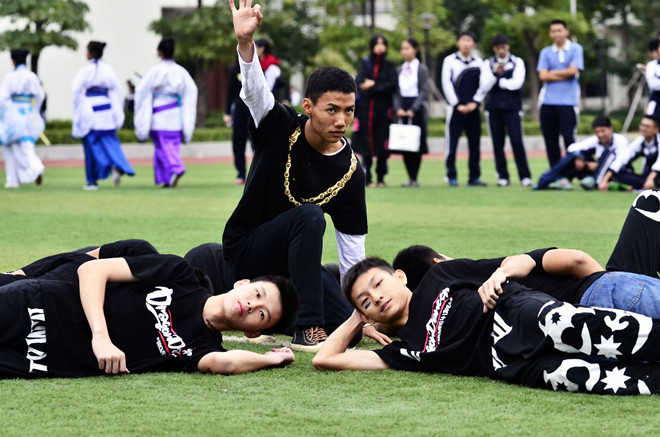 12月2日上午8:00,运动会入场式正式开始,国旗方阵、校旗方阵、级旗方阵、班级方阵迈着整齐的步伐依次入场,雄赳赳、气昂昂!在班级方阵演出的环节,同学们创意无限,展示了一个又一个极具时代气息和青春气息的精彩节目。看!高一(7)班三位男同学扮成卡通玩偶“小黄人”,呆萌的动作惹得观众捧腹大笑。高二(1)班斯文的“书生们”化身“战士”,整齐的武术表演和响亮的口号张力十足。高二(11)班女生惊艳亮相,白衬衣百褶裙加蓝色折扇,她们伴着极具“中国风”特色的优美旋律翩翩起舞,阳光自信的气质征服全场。高二(13)班则极富创意地把“中国神话”与“西方科幻”相结合,“西游记”“哈利波特”等故事频频出现,赚足了观众的眼球。“我们平时就喜欢看各种科幻作品,也喜欢这种文化的混搭,这回的创意纯属平时的积累”,班长庄玲玲同学说道。班级方阵的精彩演出将红色跑道“升级”为“露天舞台”,四围掌声、尖叫声雷动。