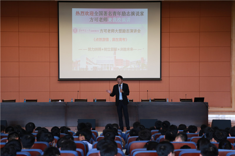 方可老师通过自身创业的故事、名人成功的经验以及高三学子的奋斗历程,坚定地告诉学生们:你,只有树立目标,充满激情和热血,拥有必胜的信念,永不言弃,才能决胜未来。“你的能量超乎你的想象”、“只要不放弃,就永远永远不可能失败”、“人生最大的敌人是自己”一句句朴实而又富含哲理的话语敲击着师生的心灵,引起了大家深深的共鸣。偌大的会场,时而掌声雷动,时而鸦雀无声,时而又呐喊迭起。