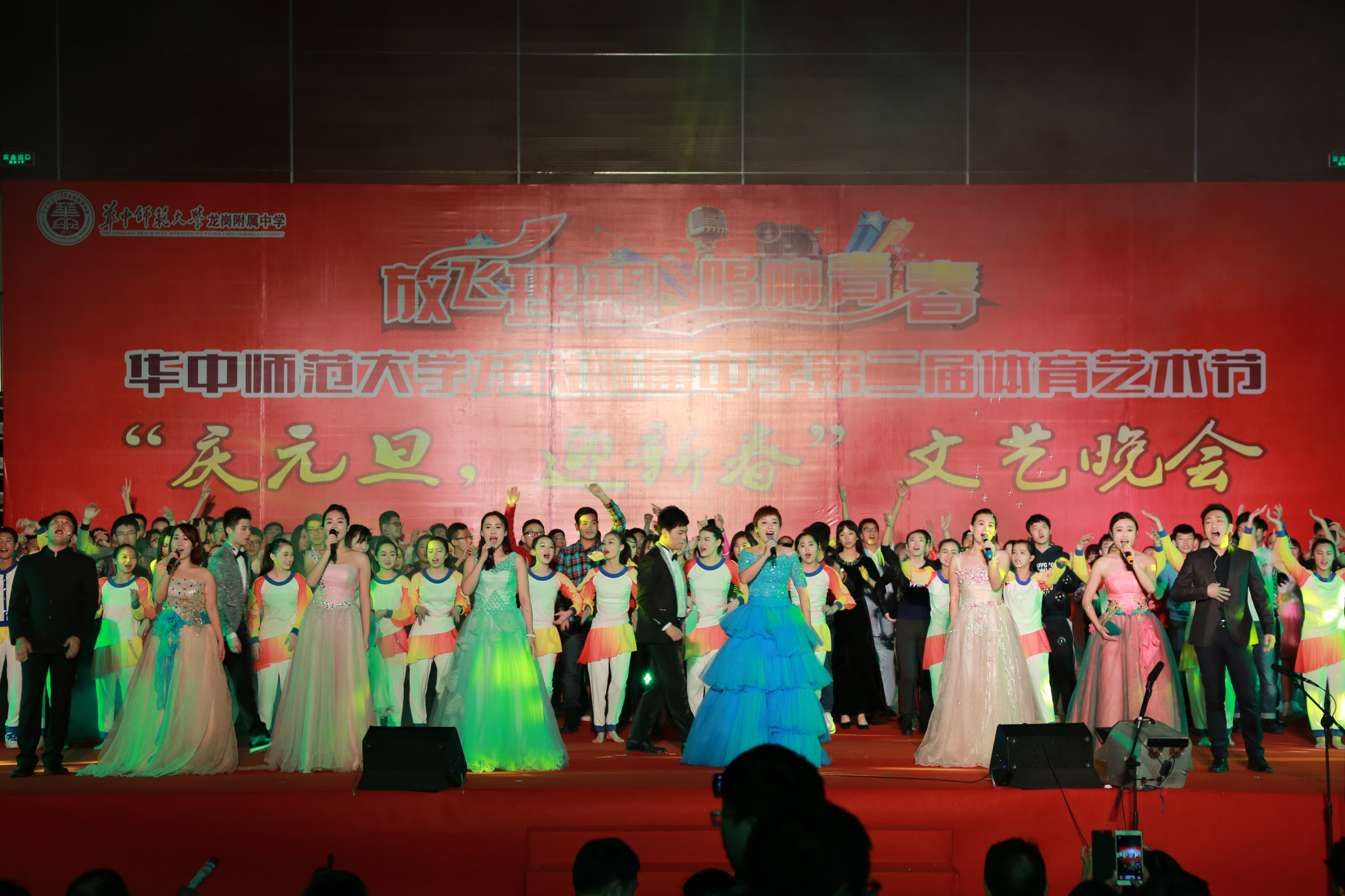 华中师大龙岗附中的老师们,既可在三尺讲台上谈吐自如,又可在舞台上忘我表演。高二年级年轻的长腿美女老师动感的《nobody》与激情、诙谐相融合的男老师《江南style》的舞蹈表演让全场的师生律动起来。高一年级老师表演的三句半,各种吐槽,各种梗,笑翻全场两位级长扮演的“财神”、“考神”用对联的形式送来新年的祝福。校长携全体行政歌曲串烧演唱,更将全场的气氛推向高潮。