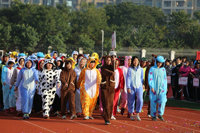 开幕式班级方阵表演创意无极限。高一13班学生动物睡衣班服赚足观众的眼球。高二7班学生表演的慢动作小鸡舞赢得全场喝彩。高二14班班长穿着小熊公仔外衣跟全班互动,呆萌的小熊形象引起一阵阵欢呼声,老师跟学生纷纷要求与其合影。班级方阵表演,学生都拿出“看家本领”,师生一起表演“小苹果”舞蹈,运动会的开幕式别开生面,惊喜连连。