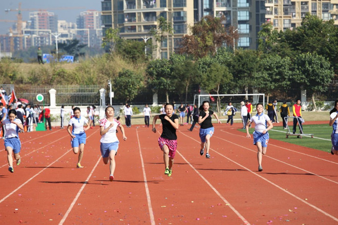 据悉,学校领导老师非常重视体育运动,学校曾获得2013年阳光体育学校称号。课间操、跑操成为学生的常规活动。每周四下午规定半个小时作为学生体育锻炼时间。华中师大龙岗附中的运动会,不仅是学生的体育盛事,老师们也积极参与。老师们的接力赛、跳绳、跳远比赛同样精彩。华中师大龙岗附中的师生共运动,在赛场上彰显青春的活力与激情。