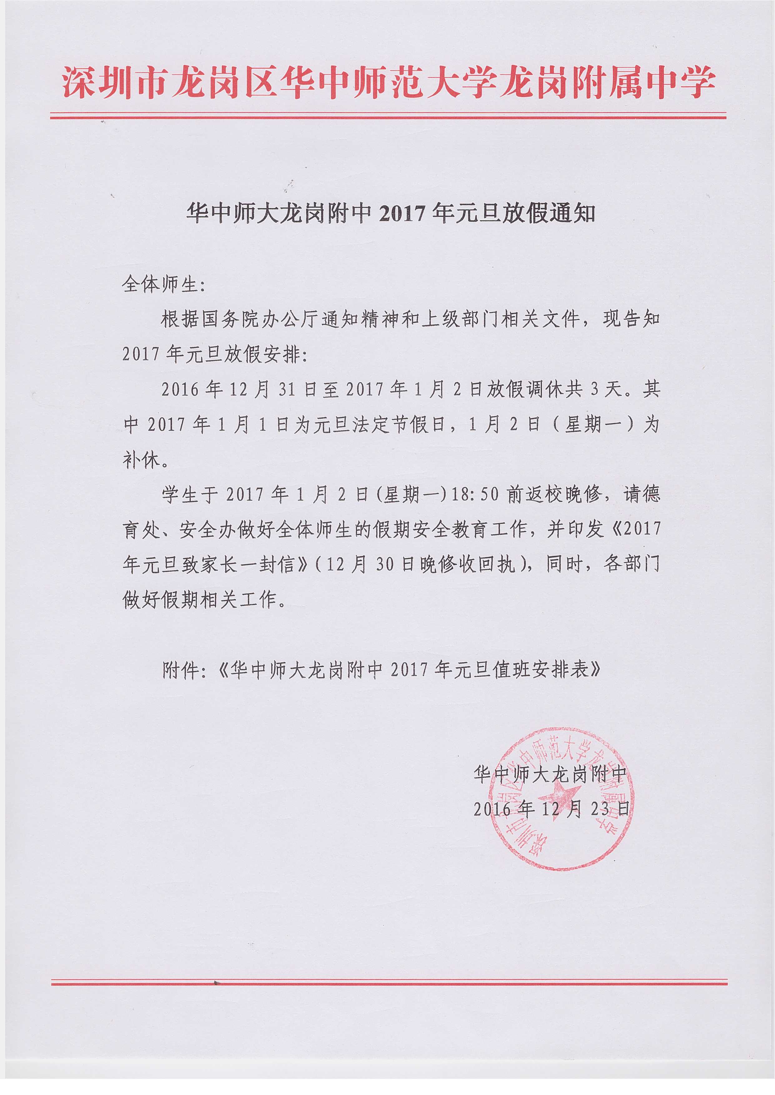 华中师大龙岗附中2017年元旦放假通知